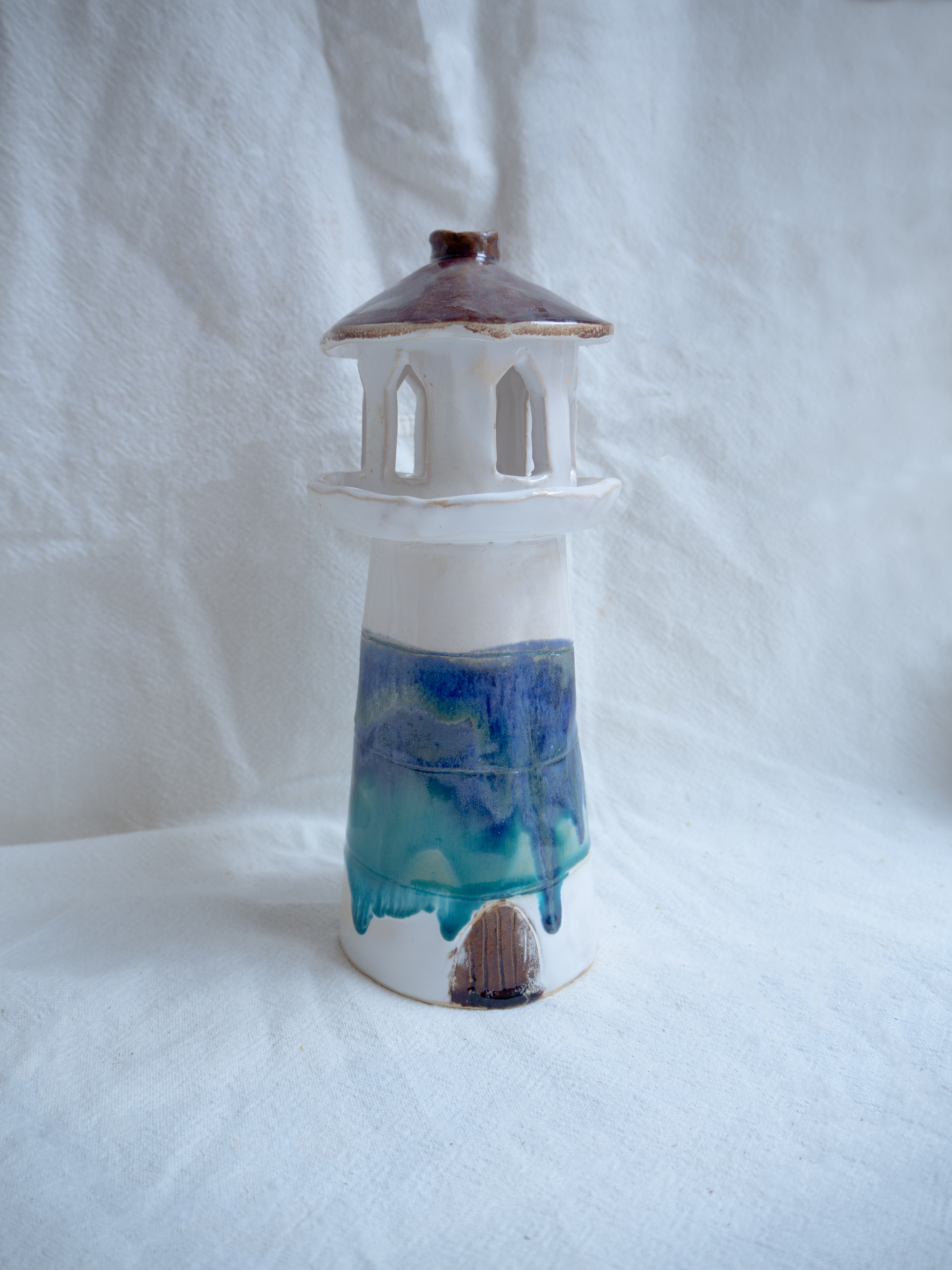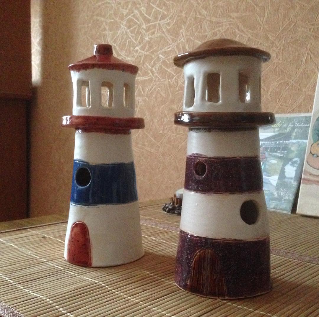 Вначале мы раскатываем глину в большой пласт, и делаем корпус. Далее - поставка под верхнюю башню и маленький забор. После этого - фигурная решетка верхней части. Это могут быть прямые окошки или фигурные - у каждого получится по-своему. Далее делаем крышу, все соединяем и только после этого приступаем к декору. Нарисовать двери и вырезать окошки, украсить маяк ступеньками, кирпичиками, ставнями, якорями - каждый подсвечник получается необыкновенно красивым!